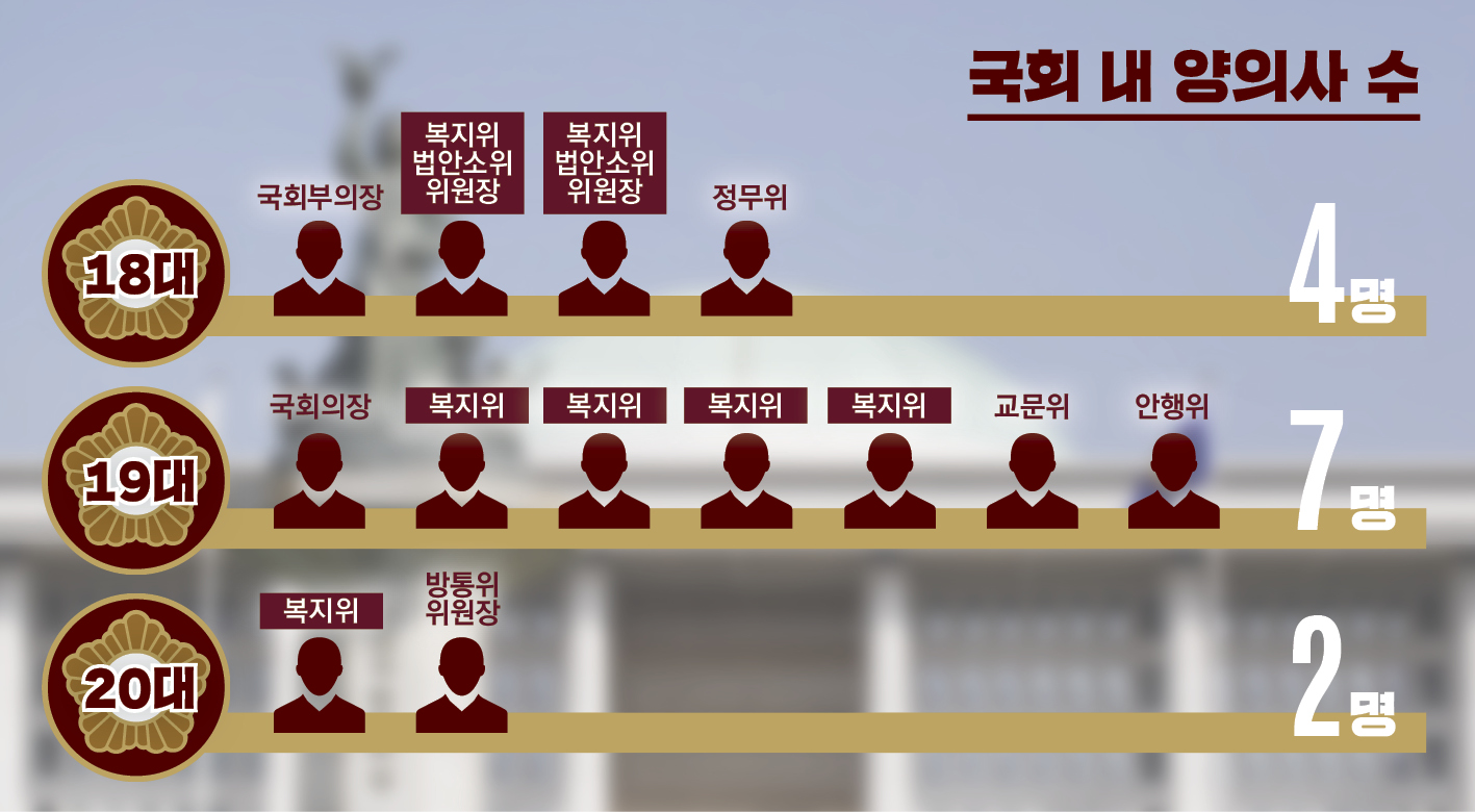 20대 국회가 한의계에 얼마나 유리한 지는 이전 국회와 비교해 보면 더욱 명확해진다. 직전인 19대를 살펴보면 의사 출신 의원이 무려 6명이나 됐다. 박인숙 의원, 정의화 의원, 안홍준 의원, 신의진 의원, 김용익 의원, 문정림 의원으로 이 중 정의화 의원은 19대 후반엔 국회의장으로 선출되기도 했다. 6명의 양의사 출신 의원들은 복지위뿐 아니라 타 상임위에서도 활동하며 양의사들과 이해를 대변하는 법안을 발의하는데 앞장섰다.