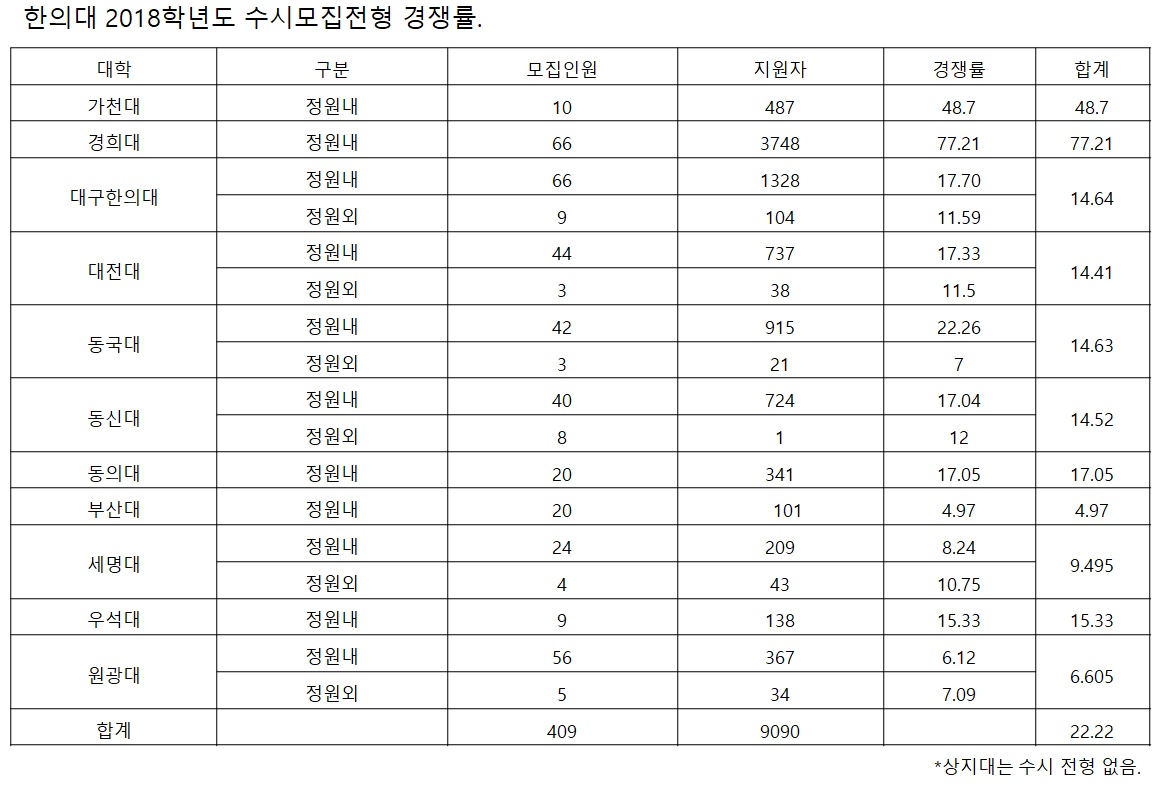 2018학년도 한의대 수시 마감…경희대 77.21대 1로 1위