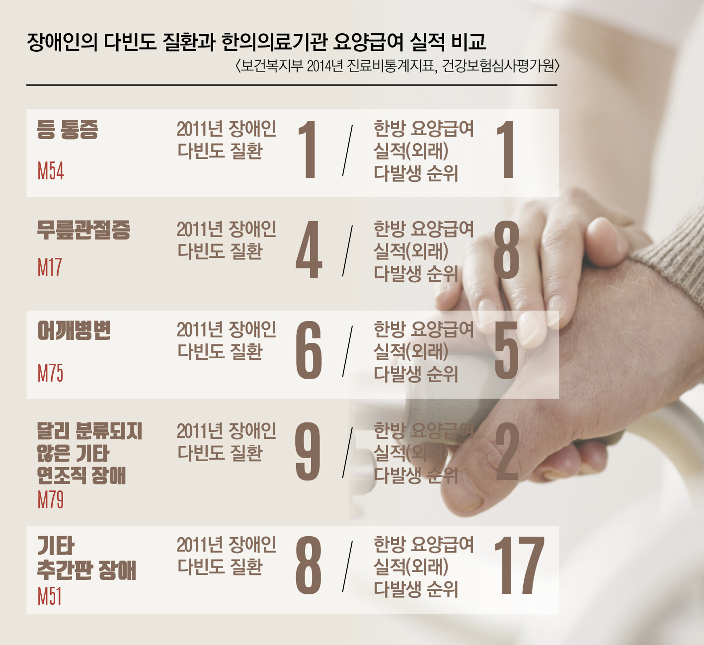 또 보건복지부에서 발표한 ‘2011년 전체인구와 장애인 다빈도 질환 20순위 비교’를 살펴보면 장애인이 가장 많이 앓고 있는 단일 질환은 ‘등 통증(M54)’인 것으로 나타났다.