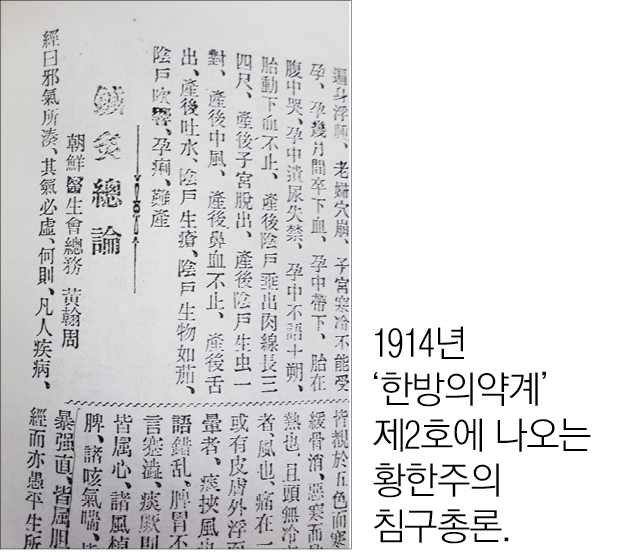 1914년에 간행된 한국 최초의 한의학 학술잡지인 『漢方醫藥界』 제2호에는 ‘鍼灸總論’이란 제목의 黃翰周의 글이 나온다.