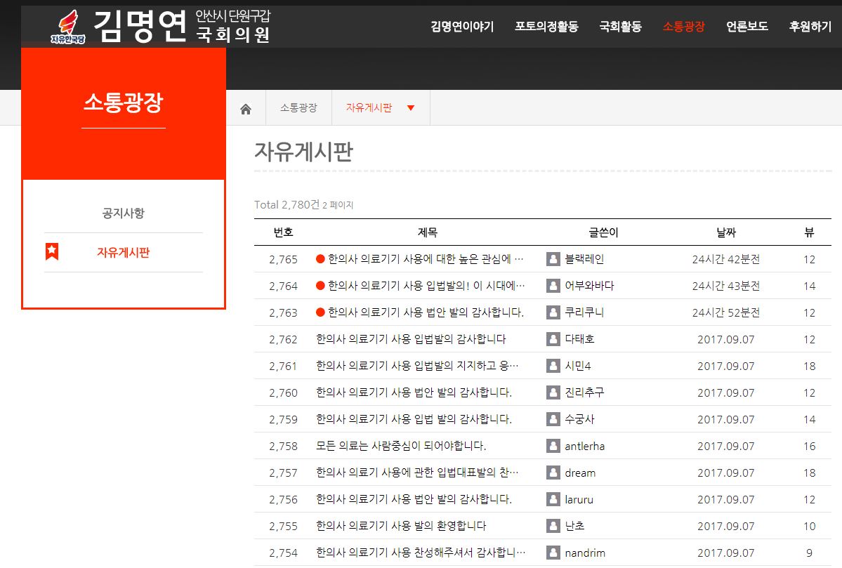 한의신문이 8일 오후 1시 기준으로 김명연 의원의 소통광장-자유게시판을 확인한 결과 약 30여개의 글이 올라와 있었다. 일부 반대의견도 있기는 했으나 주로 법안 발의에 대해 '감사하다', '환영한다', '지지한다' 등의 내용들이었다.