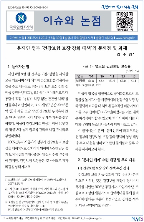 김주경 사회문화조사실 보건복지여성팀 입법조사관은 ‘문재인 정부 건강보험 보장 강화 대책의 문제점 및 과제’라는 제하의 글에서 먼저 현 정부의 계획은 건강보험 보장 기능 제고와 관련된 수단들을 총동원하고 의학적 필요성이 있는 서비스에 대해서는 급여하는 것을 원칙으로 한다는 점에서 진일보한 측면이 있다고 평가했다.