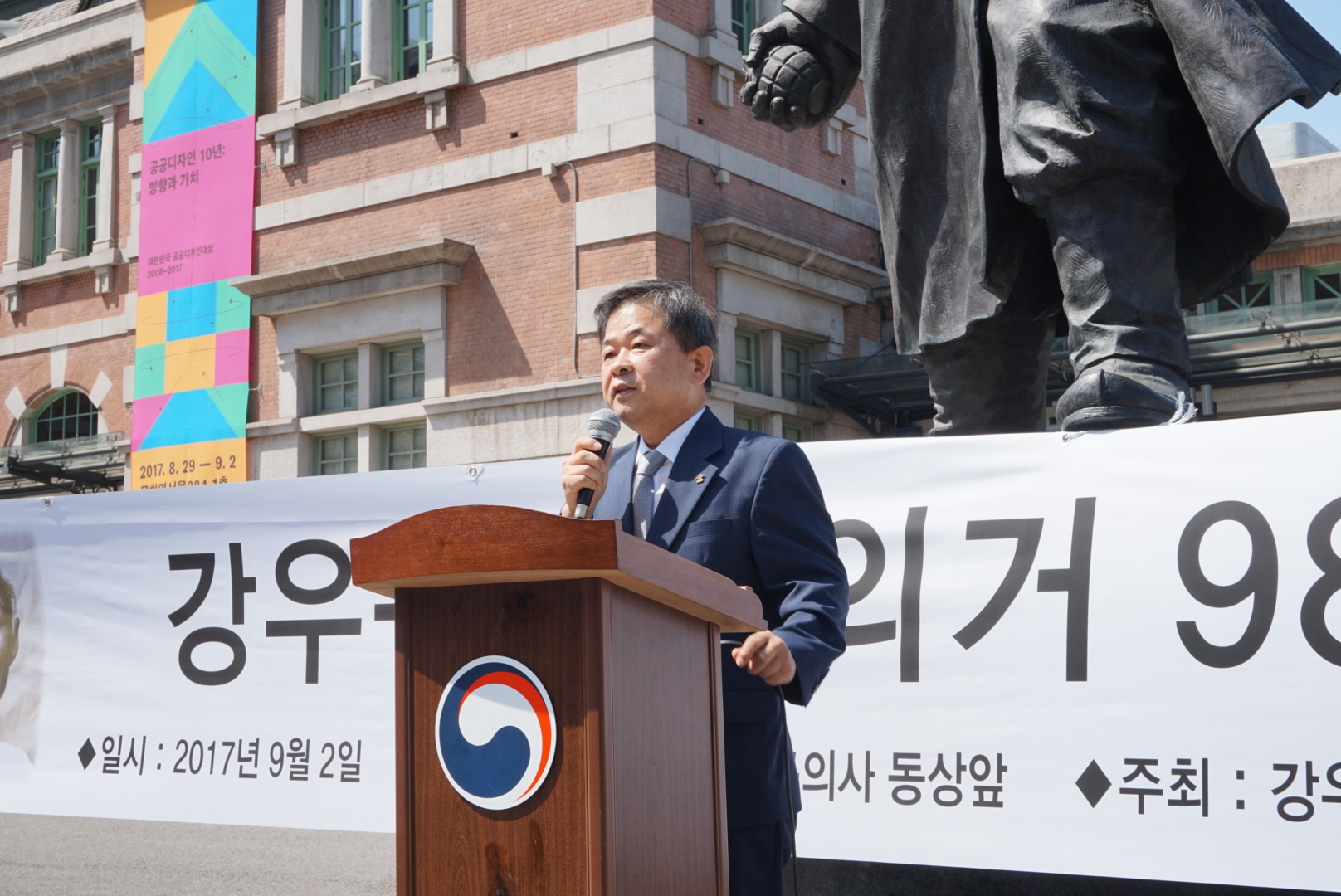 지난 2일 사단법인 강우규 의사 기념사업회의 주관으로 서울역 광장 강우규 의사 동상 앞에서 열린 '강우규 의사 의거 98주년 기념식'에는 기념사업회 관계자와 이경근 서울지방보훈청장, 박유철 광복회장, 김필건 대한한의사협회장, 시민 등 120여명이 참석한 가운데 국민의례, 기념사, 글 낭송, 만세삼창, 기념촬영 순으로 진행됐다.