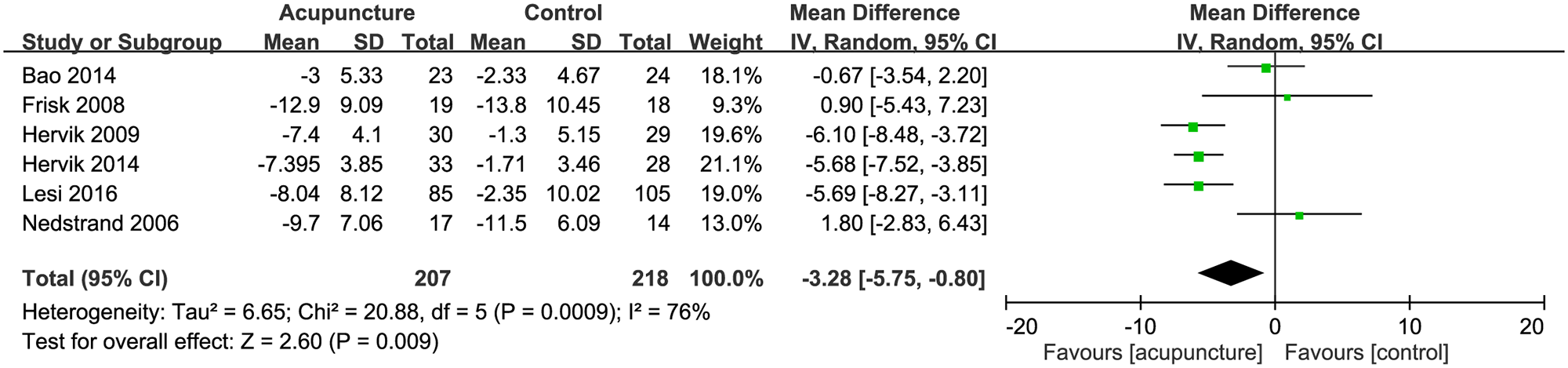 이들 논문에서 침술 실험군과 대조군의 폐경기 증상 완화 정도는 침술이 대조군보다 약 -3.28(95% CI : -5.75, -0.80, P= 0.009) 정도 증상을 개선했다.
