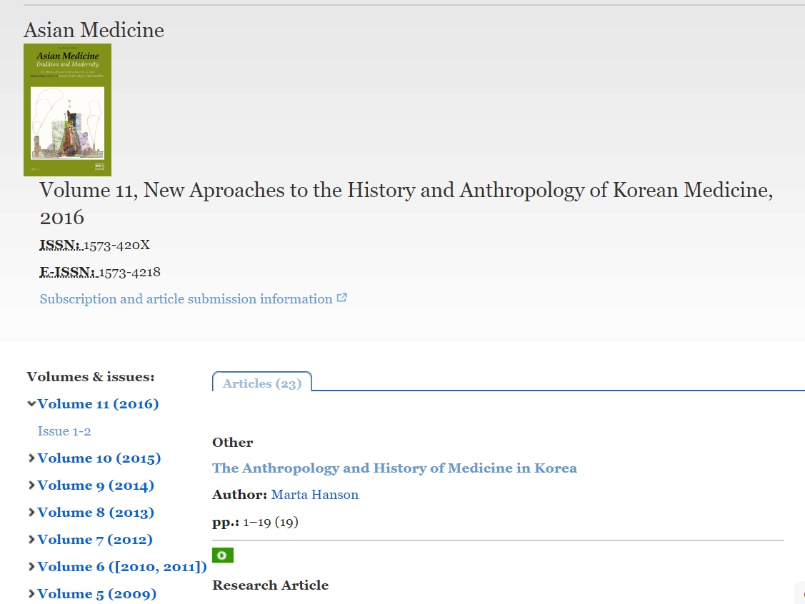 [한의신문=김대영 기자] 최근 아시아 전통의학에 관한 국제학회인 IASTAM(International Association for the Study of Traditional Asian Medicine)이 발행하는 인문사회과학분야 국제저널인 아시안 메디슨에 한의학 특집이 실려 주목받고 있다.