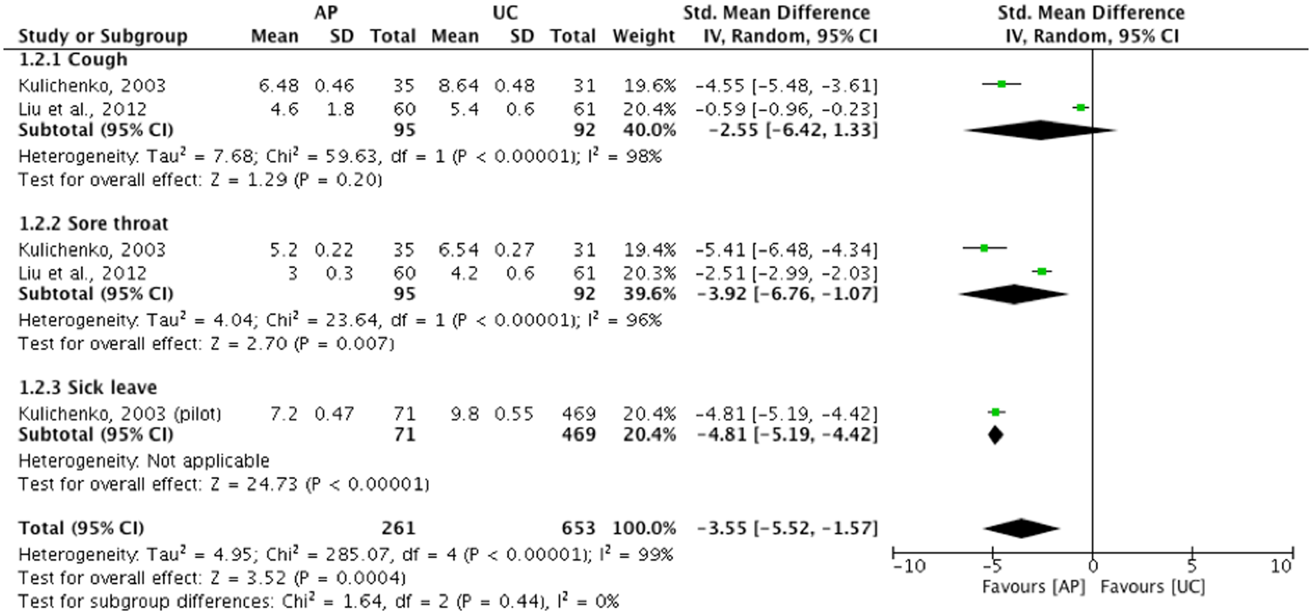 아울러 천심련은 ARTI 증상 지속 기간을 단독 항생제 치료에 비해 약 1일을 단축시켰다.(n=622, SMD: -1.27, [-1.58, -0.97], I2=67%)