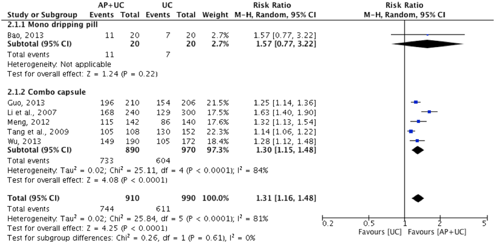 또한 천심련을 다른 항생제와 병용 투여했을 때랑 항생제를 단독 투여했을 때를 비교한 6건의 임상시험 논문에서 천심련 병용 투여군이 증상 개선에 있어 통계적으로 유의한 효과를 보였다.(n=1900, RR : 1.31, 95% CI: [1.16, 1.48], I2 =81%)