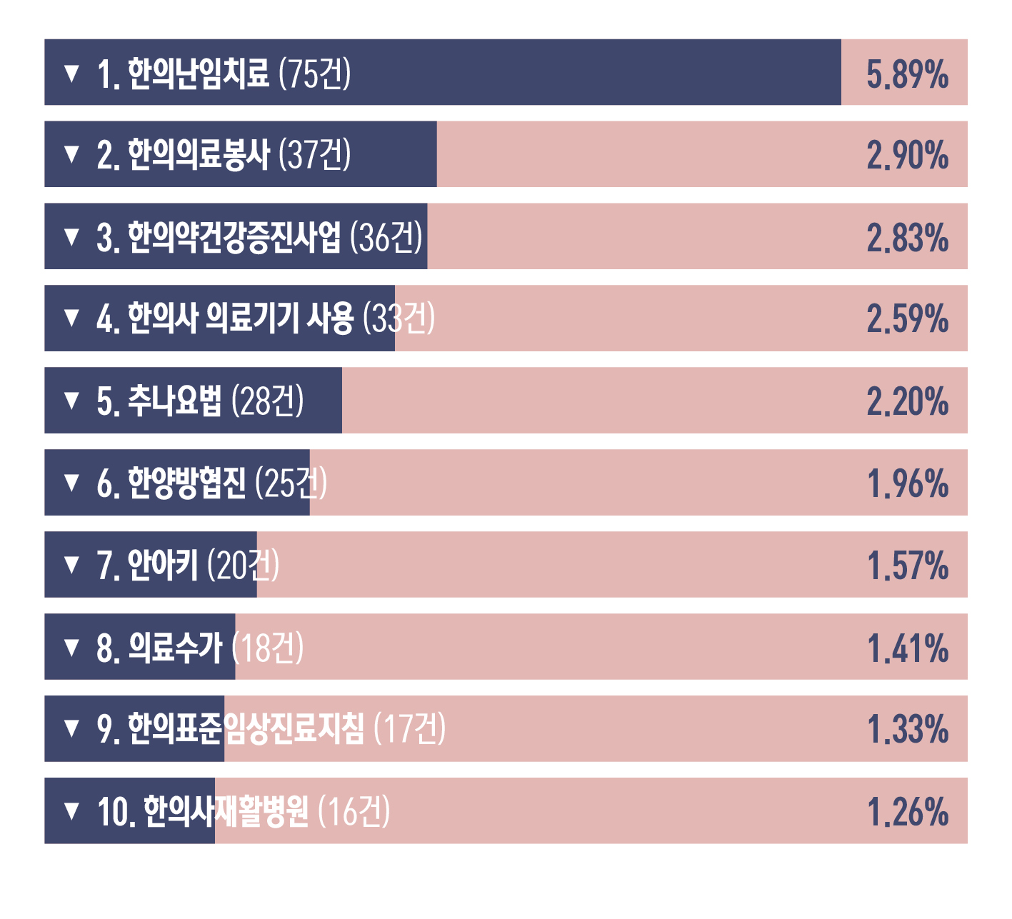 분석 결과에 따르면 한의학 분야에서 가장 큰 이슈가 됐던 핵심 키워드는 '한의난임치료(5.89%·75건)'로 나타났으며, 이어 △한의의료봉사(2.90%) △한의약건강증진사업(2.83%) △한의사 의료기기 사용(2.59%) △추나요법(2.20%) △한양방협진(1.96%) △안아키(1.57%) △의료수가(1.41%) △한의표준임상진료지침(1.33%) △한의사재활병원(1.26%) 등의 순으로 나타났다.