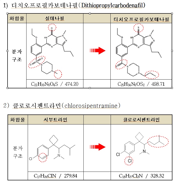 디치오프로필카보데나필은 미국계 제약사인 화이자가 개발한 발기부전치료제인 비아그라의 주성분인 실데나필의 유사 물질이다. 시부트라민은 과거 시판· 유통됐던 비만치료제의 주성분인 ‘시부트라민’의 유사 물질이다.