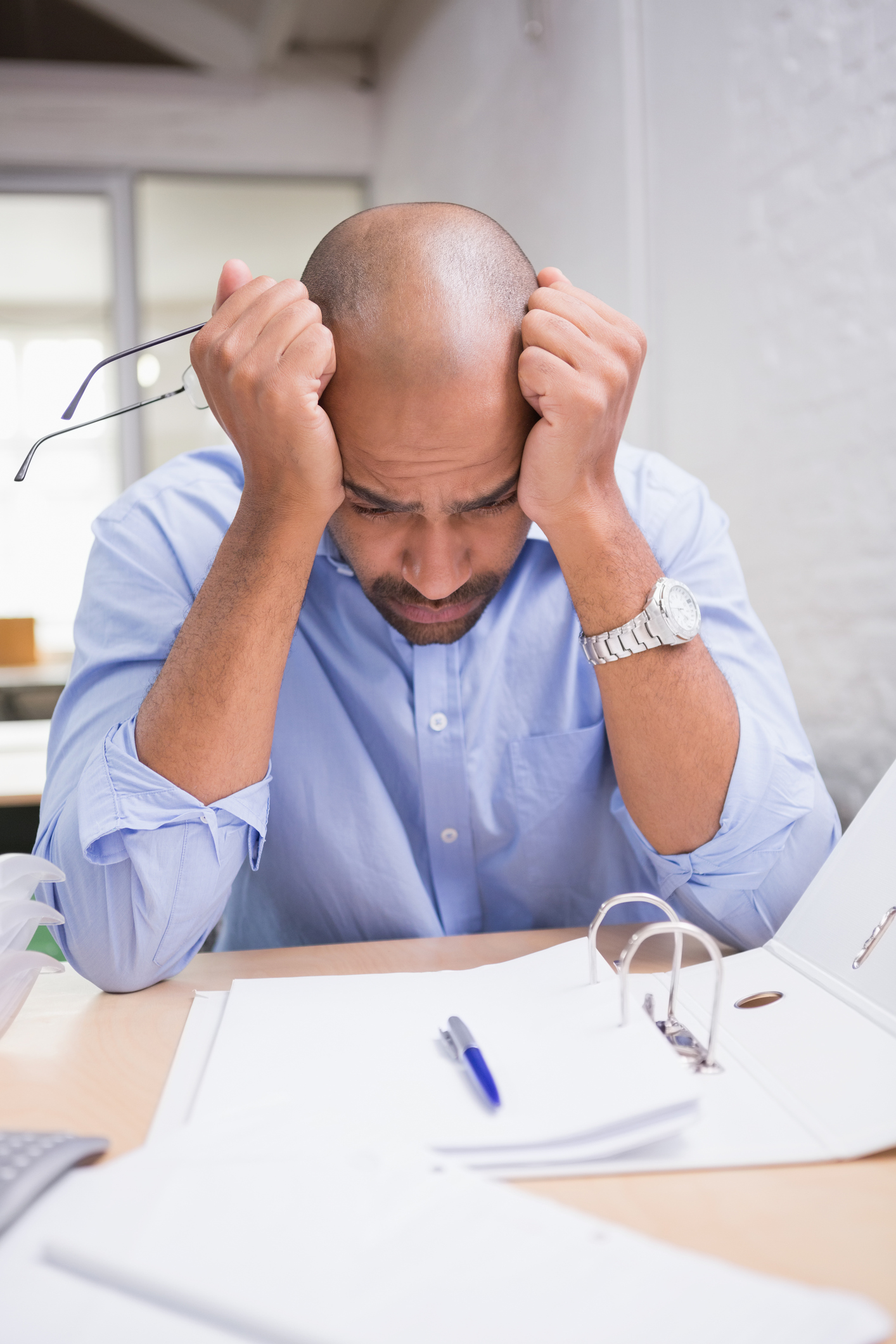 Tired young businessman with paperwork at office desk