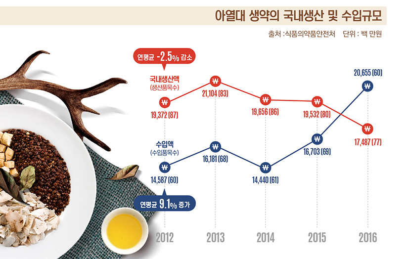 아열대 생약의 국내 생산액은 지난 2013년 약 211억원을 정점으로 매년 감소하고 있다. 그럼에도 아열대 생약의 수입액은 지난 2012년 약 145억원에서 지난해 200억원(206억 5500만원) 대를 돌파했다.