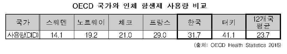 우리나라는 하루 1000명당 31.7명(DID)이 항생제를 처방받고 있는데 이는 OECD 평균 23.7명보다 30% 이상 높은 수준이다.