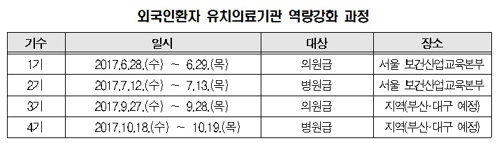 교육내용은 △외국인환자 유치 의료기관 평가제도 △외국인환자 의료서비스 및 리스크 관리 △외국인환자 유치 관련 법률 △외국인환자 유치 의료기관 운영체제 등이다.
