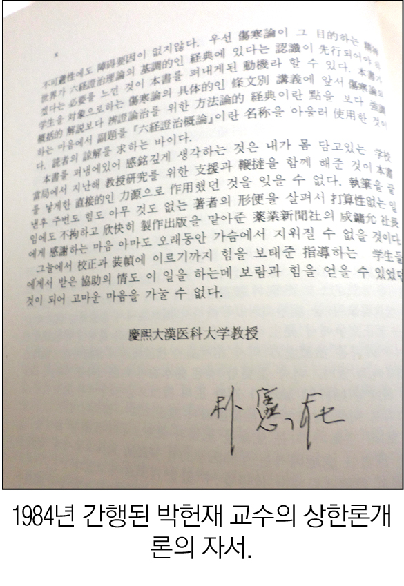 kni-web[한의신문] 朴憲在 敎授(1921∼2011)는 경희대 한의대 교수를 역임하면서 『傷寒論』을 전문 과목으로 각종 연구 성과를 이루어낸 대학자이다. 그는 경희대 한의대 교수로 재직하는 동안에 『傷寒論槪論』(부제: 六經證治槪論)(1984년 약업신문사 간행)이라는 교재 성격의 저술을 간행했다. 이 책에서 그는 傷寒의 六經證治에 대한 그의 견해를 피력했다. 아래에 이를 그의 목소리로 요약해 본다.
