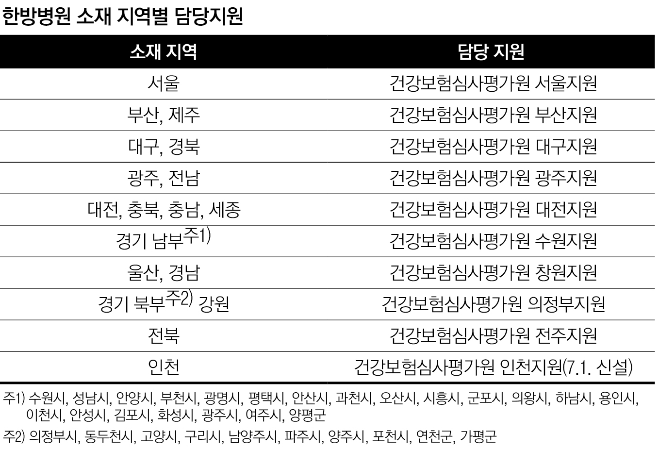 이에 따라 내달 1일부터는 한방병원 진료비 청구명세서 접수부터 심사, 이의신청, 의료자원 현황신고 등 제반 업무를 각 지역 관할 지원이 수행하게 되며, 내달 인천지원이 신설됨에 따라 한방병원 진료비 심사는 10개 지원 체제로 운영된다.