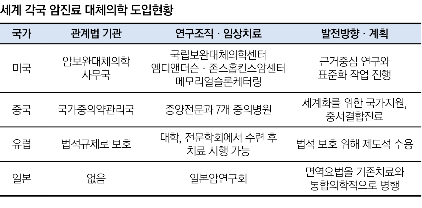 사실 존스 홉킨스병원과 엠디 앤더슨 암센터, 하버드의과대학 부속병원인 다나 파버 암연구소, 메모리얼 슬로언-케터링 암센터 등 세계적 명성을 얻고 있는 주요 암센터들은 하나같이 한·양방 협진을 실시하고 있을 뿐 아니라 여러 의료 선진국들 또한 한의약을 진료에 적극 활용하고 있다.