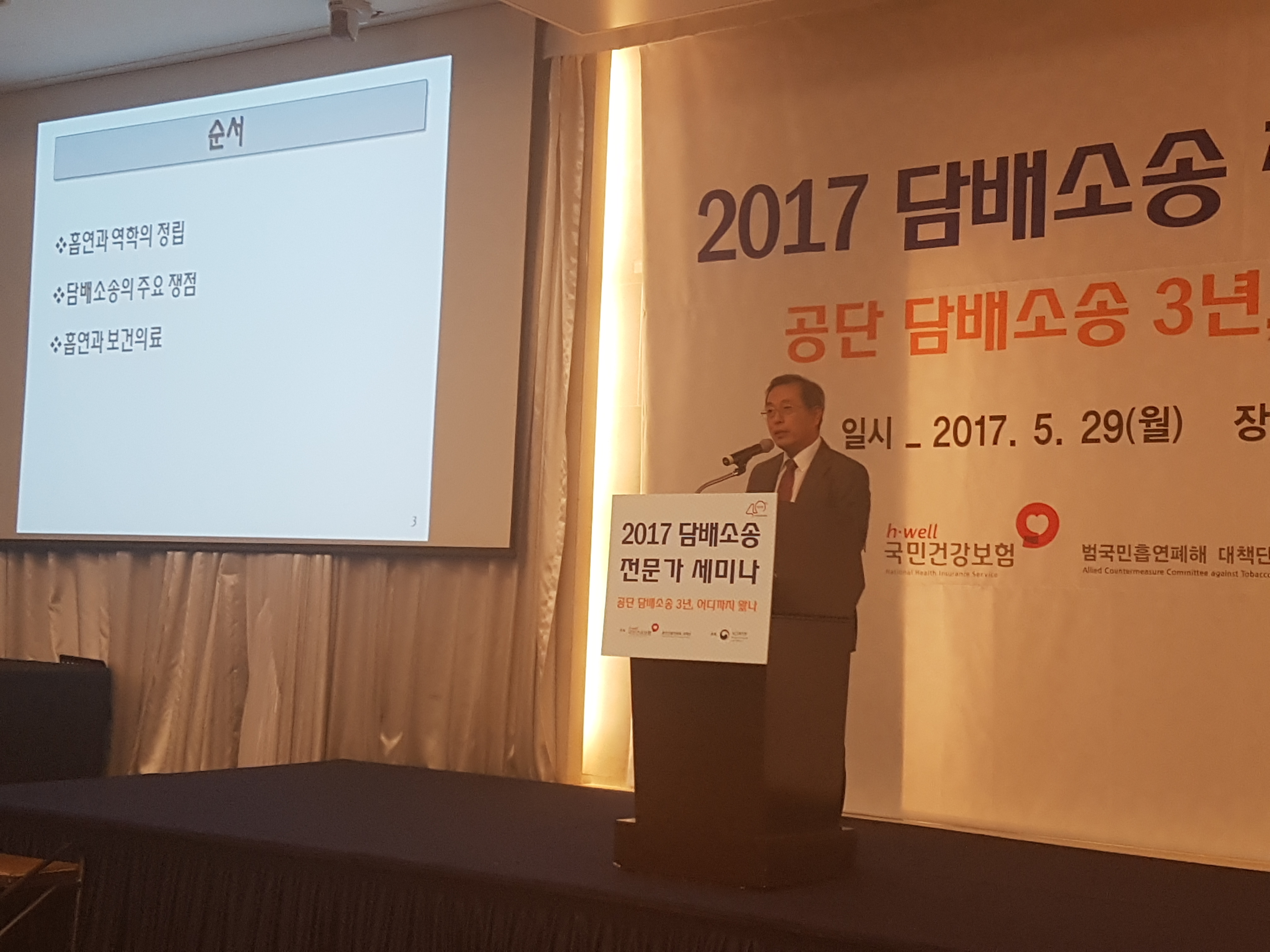 지난 29일 서울 마포구 스탠포드호텔에서 열린 ‘2017 담배소송 전문가 세미나’에서 건보공단 측 변호를 맡았던 정미화 법무법인 남산 변호사는 ‘담배소송 진행 경과 및 향후 진행 방향’ 발표에서 “담배 제조사가 책임을 인정 안하고 원고에 모든 걸 입증하라고 시간을 끌고 있다”며 “3년 동안 12회의 변론기일까지 진행한 상태”라고 밝혔다.