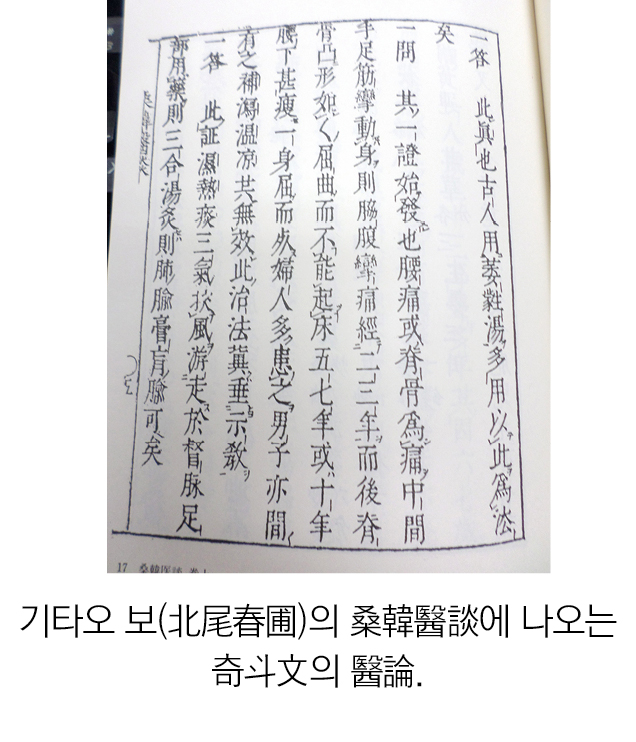 “키타오 슌보(北尾春圃)가 다음과 같이 물었다. ‘어떤 증상이 처음 요통 또는 척골이 아픈 것으로 시작합니다. 그 사이에 수족의 근육이 연동하고 脇腹에 攣痛이 있으면서 2,3년을 지나면 척골의 튀어나온 부위가 〈 모양의 굴곡이 생기면서 일어나지 못합니다. 그러기를 5년 10년이 지나면 허리아래가 심하게 위축되면서 몸이 구부러지면서 죽습니다. 부인들이 이런 증후를 앓는 경우가 많고 남자들도 간혹 있는데, 補瀉溫涼의 어떤 방법을 써도 효과가 없었습니다. 그 치료방법에 대해 가르침을 부탁드립니다.’ 이에 奇斗文이 다음과 같이 대답하였다. ‘이 증상은 濕熱痰의 사기가 風邪를 끼고 督脈과 다리에 퍼져서 생긴 것입니다. 三合湯을 쓰고 肺兪와 膏肓兪에 뜸을 떠서 치료하면 됩니다.’([一問(北尾春圃) : 其一證 始發也. 腰痛或脊骨爲痛, 中間手足筋攣, 動身則脇腹攣痛, 經二三年而後脊骨凸形如〈 ,屈曲而不能起床. 五七年或十年, 腰下甚瘦一身屈而死. 婦人多患之, 男子亦間有之. 補瀉溫凉, 其無效. 此治法, 冀垂示敎.)”(『桑韓醫談』. 번역은 서근우의 것을 따름)