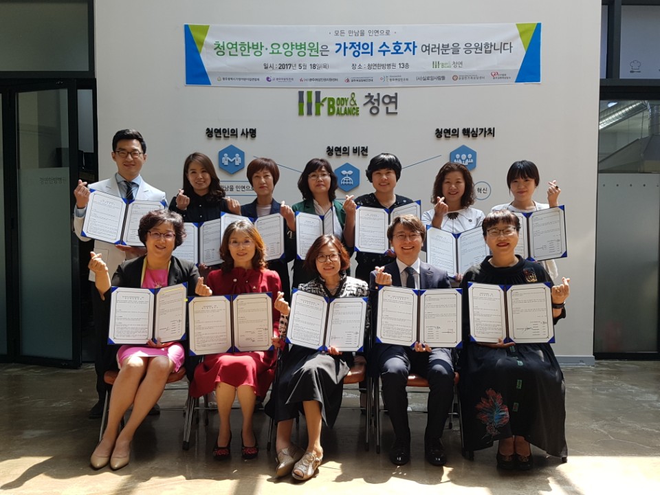 [한의신문=강환웅 기자]청연한방병원이 가정의 달을 맞아 18일 '가정의 수호자'로 활동하고 있는 △광주시가정어린이집연합회 △광주여성민우회 △광주여성의 전화 △광주여성인권지원센터 △(사)실로암사람들 부설 광주장애인가정상담소 및 여성장애인가정폭력피해자보호시설 ‘새날’ △(사)한국여성장애인연합 광주지부 △송광한가족상담센터 △인구협회광주성폭력상담소 등 광주 지역 보육·인권·여성 관련 8개 사회단체와 업무협약을 체결했다.