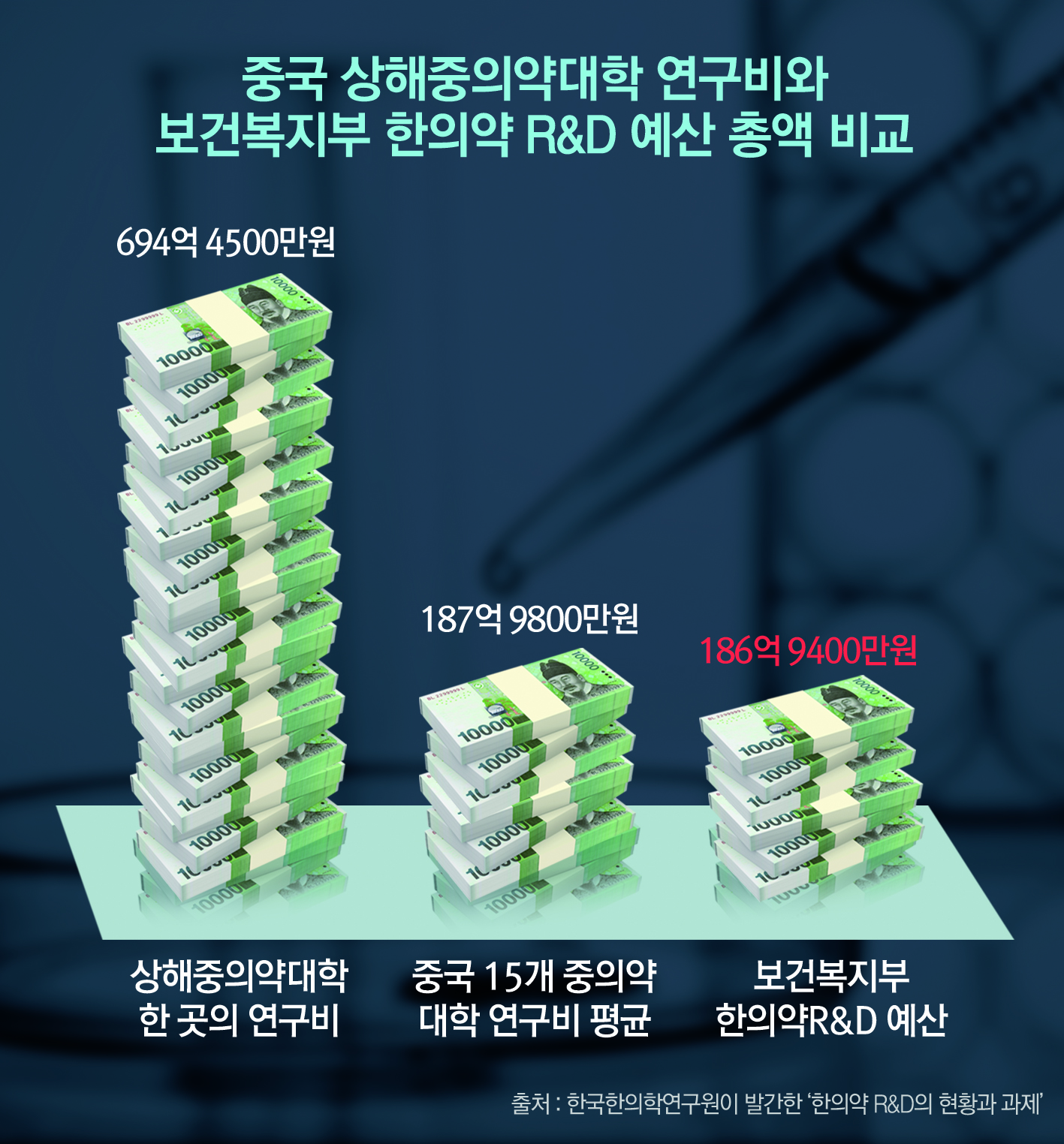 보건복지부의 한의약 R&D 전체 예산(2016년 186억9400만원)은 중국 중의약대학 한곳의 연구비(상하이 중의약대학 중의약 연구비 : 694억4500만원)에도 미치지 못할 뿐 아니라 전체 보건의료분야 R&D 중 한의약이 차지하는 비중도 고작 5.57%에 불과한 실정이다.(2010년~2014년 최근 5년간 보건의료분야 R&D규모 5조6879억원)