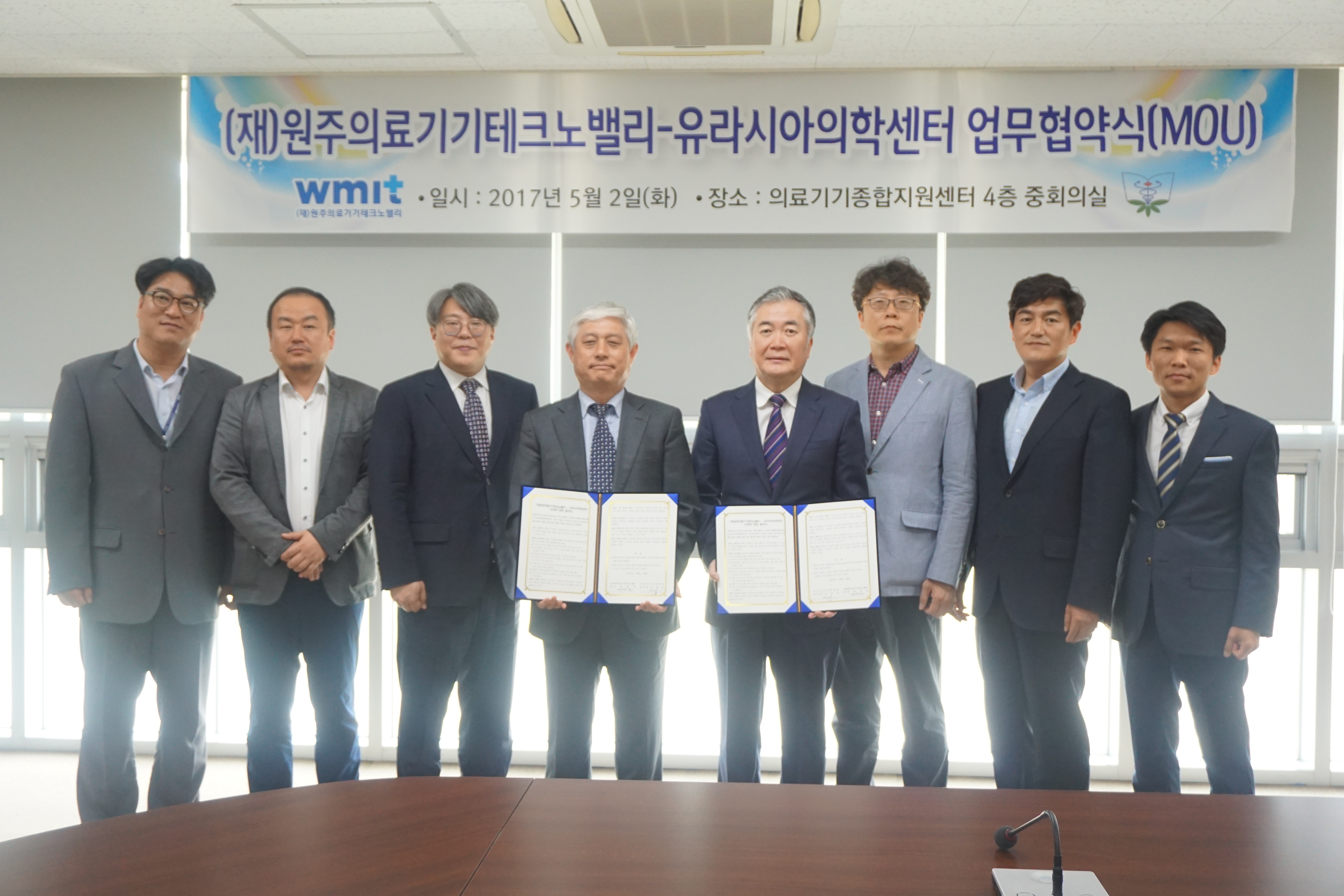 이응세 유라시아의학센터장(오른쪽에서 4번째)이 2일 강원도 원주시 원주의료기기테크노밸리 의료기기종합지원센터에서 열린 업무협약을 체결한 후 기념촬영을 하고 있다.