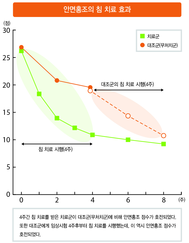 또한 갱년기 및 폐경기 이후 여성 175명을 대상으로 4주 동안 12회에 걸쳐 침치료를 받은 군과 그렇지 않은 군을 무작위로 배정해 결과를 평가한 결과 침 치료의 경우 최대 80%의 호전율을 보이는 실험군도 있는 등 평균 50%의 호전율을 기록했다. 즉 침 치료를 받은 여성들의 경우에는 안면홍조 점수가 평균 16.56점 감소한 반면 대조군은 6.93점이 줄어드는데 그쳤으며, 대조군에도 시험 4주 후부터 침 치료를 시행한 결과 대조군에서도 안면홍조 점수의 감소를 확인할 수 있었다.