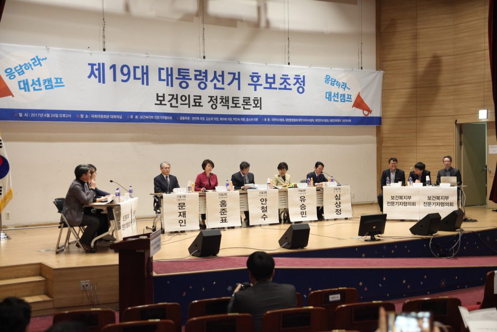 지난달 24일 국회 의원회관 대회의실에서 열린 정책토론회에서 전문지기자 패널들의 질의에 5개 대선후보 캠프 관계자들이 답하고 있다.