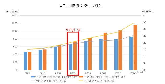 최근 대한무역투자진흥공사(이하 KOTRA)의 '초고령사회 일본의 치매 예방 비즈니스 최신 동향(고충성 일본 후쿠오카무역관)'에 따르면 일본은 지난해 기준으로 고령화율이 26.7%에 달하고 있으며, 이미 1994년 고령사회에 진입한데 이어 2007년 초고령사회로 접어드는 등 전 세계에서 가장 빠른 속도로 고령인구가 증가하는 국가 중 하나다.