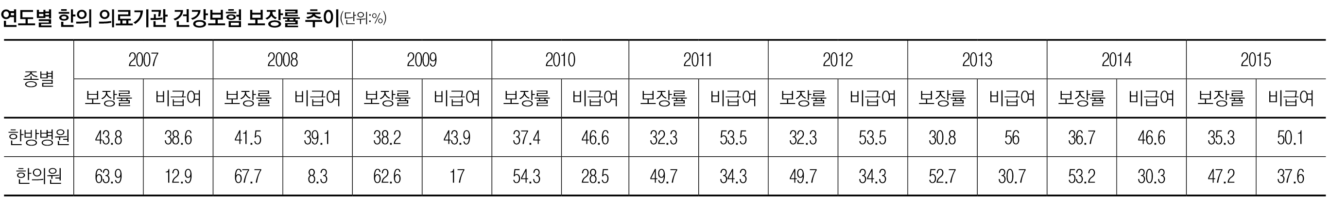 2015년 한방병원의 보장률은 35.3%로 그 이전해의 36.7%보다 1.4%p떨어진 것으로 드러났다. 비급여부담률은 50.1%로 그 이전해의 46.6%보다 3.5%p 증가한 것으로 확인됐다.