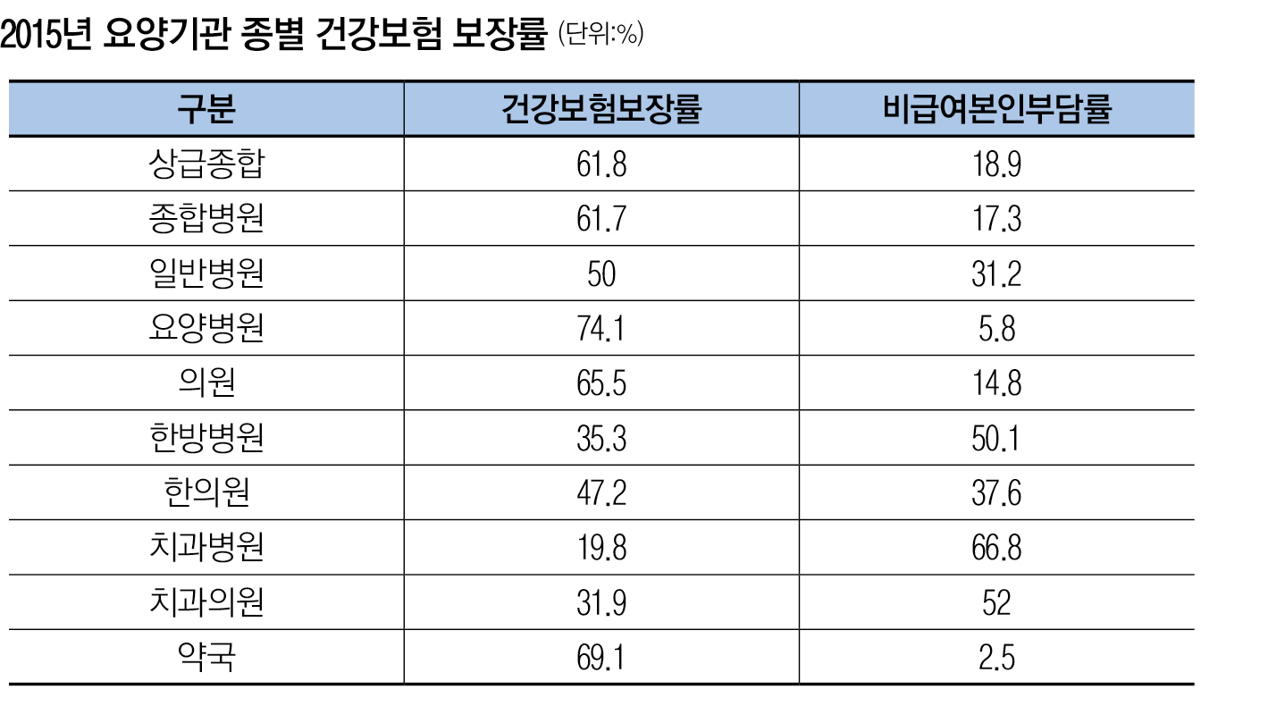 요양기관 종별을 합친 2015년 전체 건강보험 보장률은 이전해보다 0.2%p 상승한 63.4%로 밝혀졌다.