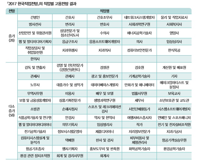 고용노동부·한국고용정보원, '2017 한국직업전망'서 밝혀