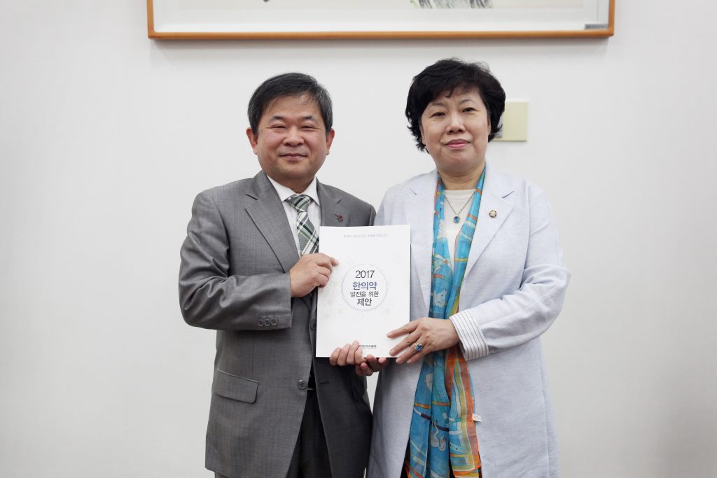 지난 7일 국회 본관 2층 국민의당 정책위의장실에서 김필건 한의협회장이 조배숙 정책위의장(우)에게 '2017 한의약 발전 제안'을 전달한 뒤 기념사진을 찍고 있다.