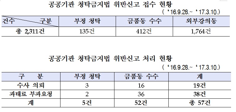 청탁금지법 시행 6개월…2311건 접수 중 57건 수사의뢰
