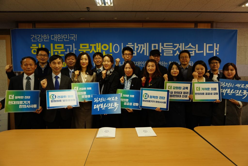 지난 1일 국회의사당 인근 더불어포럼 사무실에서 열린 정책공약 건의서 전달식에 참여한 하니문 관계자들이 지지선언을 하며 기념사진을 찍고 있다.