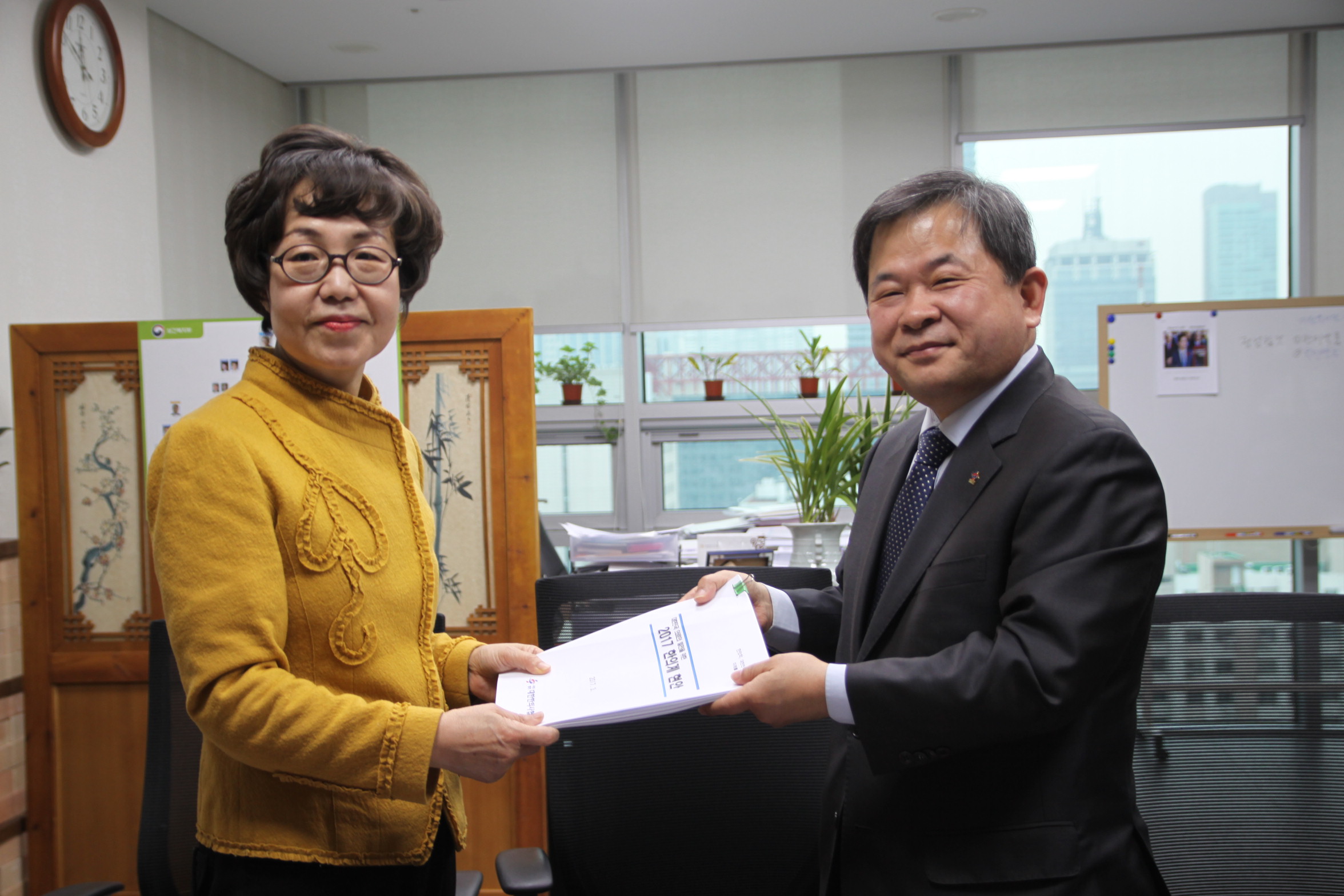 지난 20일 국회 의원회관 권미혁 의원실에서 열린 '국민보건향상 위한 수요자 중심 정책협약식'에서 김필건 한의협회장(우)이 권미혁 의원(좌)에게 한의계 정책건의서를 건네고 있다.