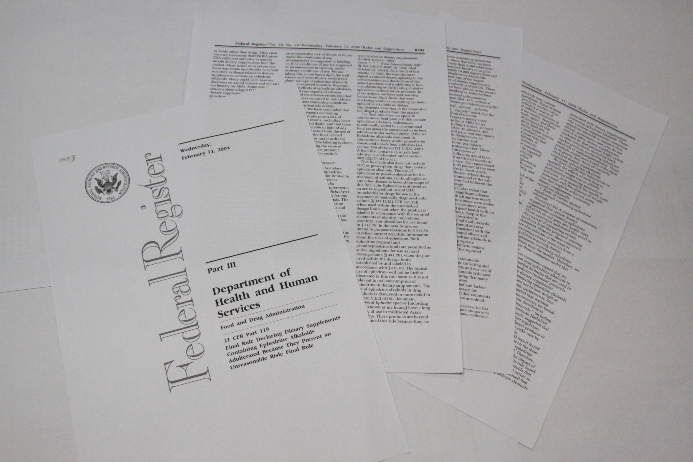 FDA의 관련 규제는 미국 관보 'Final Rule Declaring Dietary Supplements Containing Ephedrine Alkaloids Adulterated Because They Present an Unreasonable Risk'에 나와 있다.