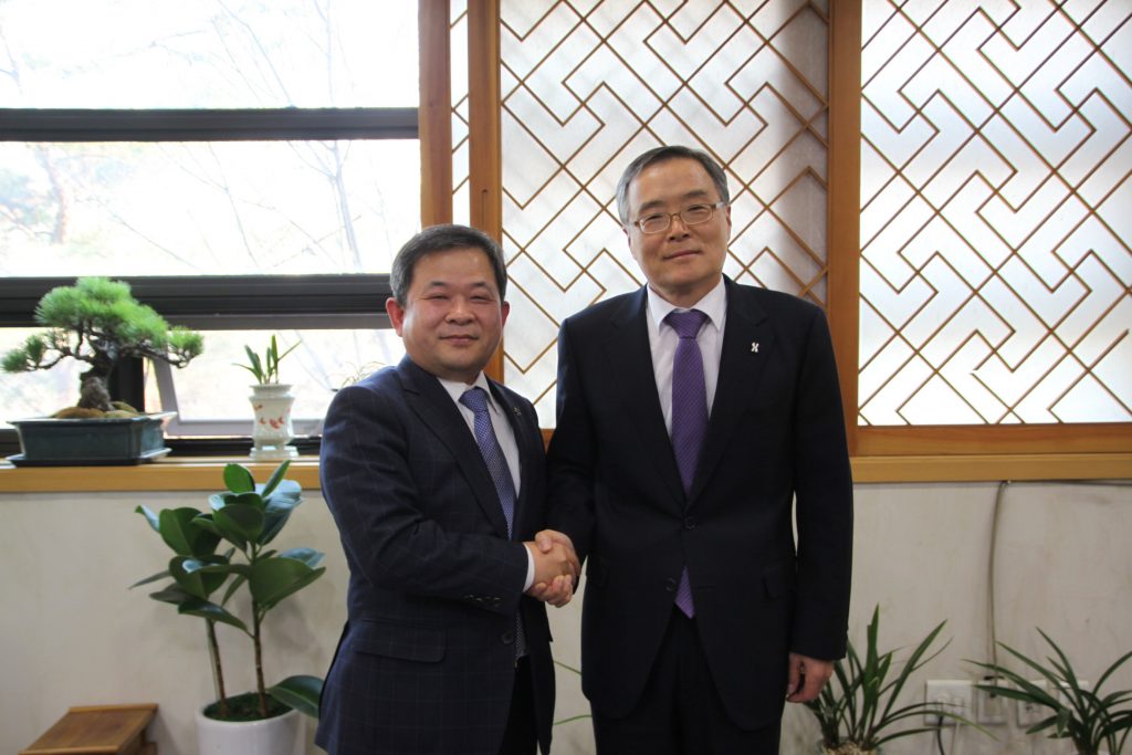 지난 15일 김승택 신임 심평원장이 한의협을 방문해 김필건 한의협 회장과 악수를 하고 있다.