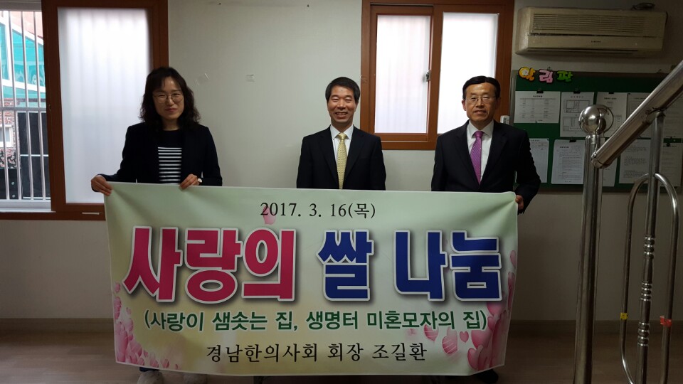 [한의신문=강환웅 기자]경상남도한의사회(이하 경남지부)는 16일 생명터 미혼모자의 집과 가족폭력 피해자 보호시설인 '사랑이 샘솟는 집'을 각각 방문해 사랑의 쌀 나눔행사를 가졌다.