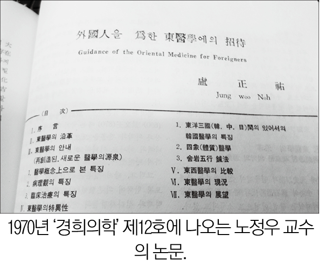 kni-web[한의신문] 1970년 12월 경희대 한의대 학생회는 『慶熙醫學』제12호를 간행한다. 이 잡지에는 盧正祐 敎授의 「外國人을 爲한 東醫學에의 招待」라는 제목의 논문이 실려 있다.