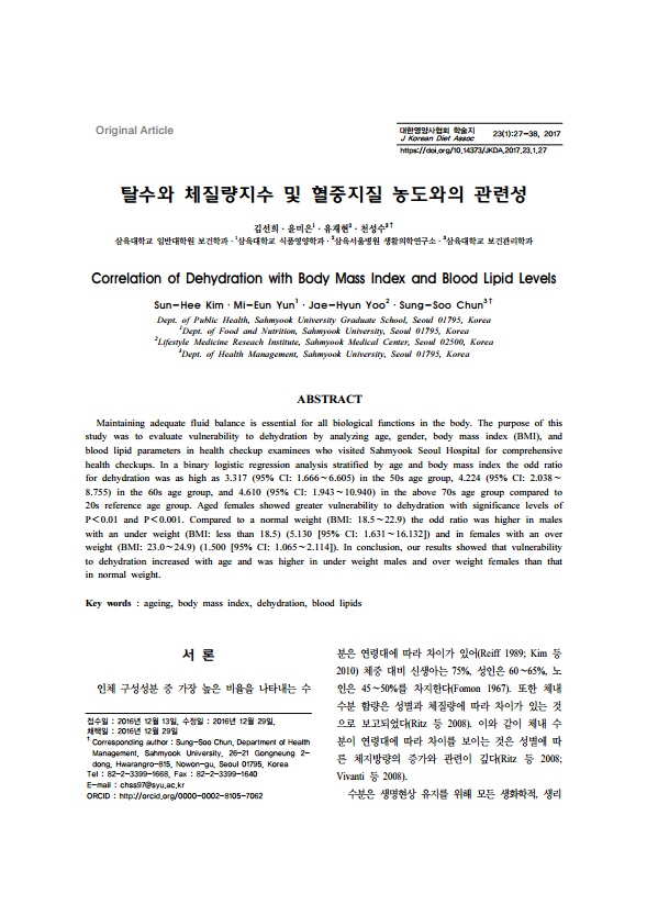 이번 연구결과(탈수와 체질량지수 및 혈중지질 농도와의 관련성)는 대한영양사협회지 최근호에 소개됐다.
