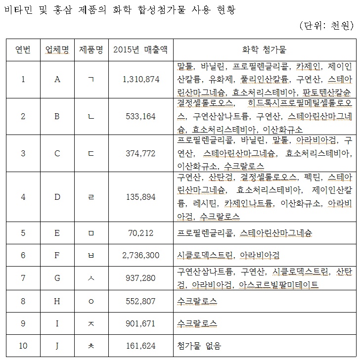 특히 감사원이 감사기간 중 비타민 제품 및 홍삼 제품 매출 상위 10위 이내 제품 중 각각 5개씩 총 10개 제품을 무작위로 추출해 화학 합성첨가물 사용 현황을 조사한 결과 A업체 어린이용 건기식인 ㄱ제품의 경우에는 이 업체가 생산하는 성인용 비타민 제품에는 아스파탐 1종의 화학 합성첨가물이 들어 있는데 반해 ㄱ제품에는 11종의 화학 합성첨가물이 포함돼 있는 등 어린이용 건기식에 대한 화학 합성첨가물 관리가 제대로 되지 않는 것으로 확인됐다.