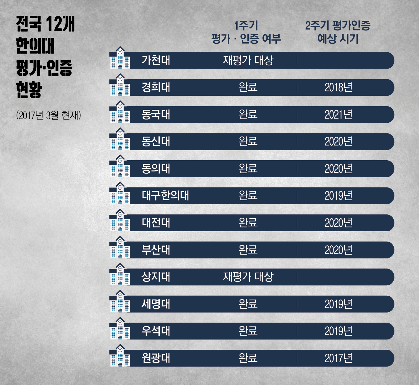 [한의신문=민보영 기자]가천대·상지대가 한국한의학교육평가원(이하 한평원)의 평가·인증에서 한시적 인증 판정을 받으면서 다른 한의대의 평가·인증 현황과 향후 일정에 관심이 쏠리고 있다.