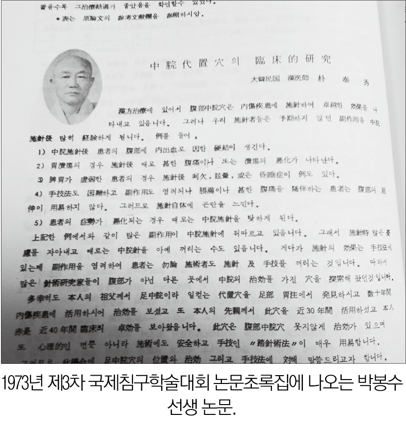 [한의신문] 朴奉秀 先生(1910∼?)은 1973년 9월 서울에서 열린 제3차 국제침구학술대회에서 ‘中脘代置穴의 臨床的硏究’라는 제목의 논문을 발표한다.