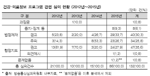 실제 최근 한국방송학회가 방송통신심의위원회(이하 방심의)에 제출한 '건강·의료정보 프로그램 심의 개선방안' 보고서에 따르면 2012년부터 2015년까지 건강․의료 프로그램에 대해 내려진 심의 결과 심의 규정 위반 정도가 사례가 급증하고 있는 것은 물론 질적으로도 더욱 심각해지고 있다.