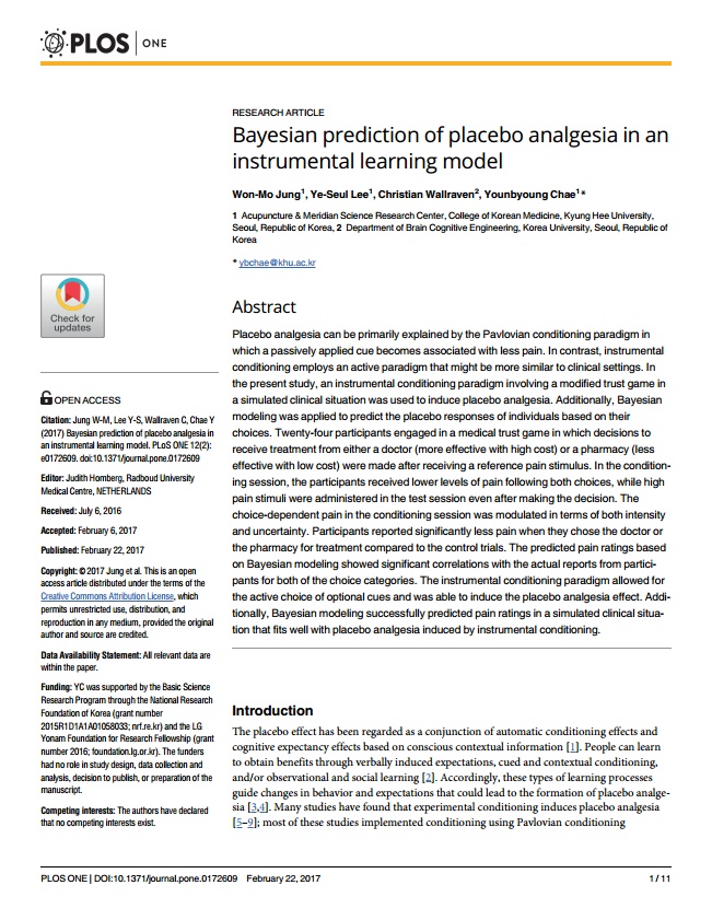 이번 연구결과는 플러스원(PLoS One) 저널에 “Bayesian prediction of placebo analgesia in an instrumental learning model”라는 제목으로 게재됐다.