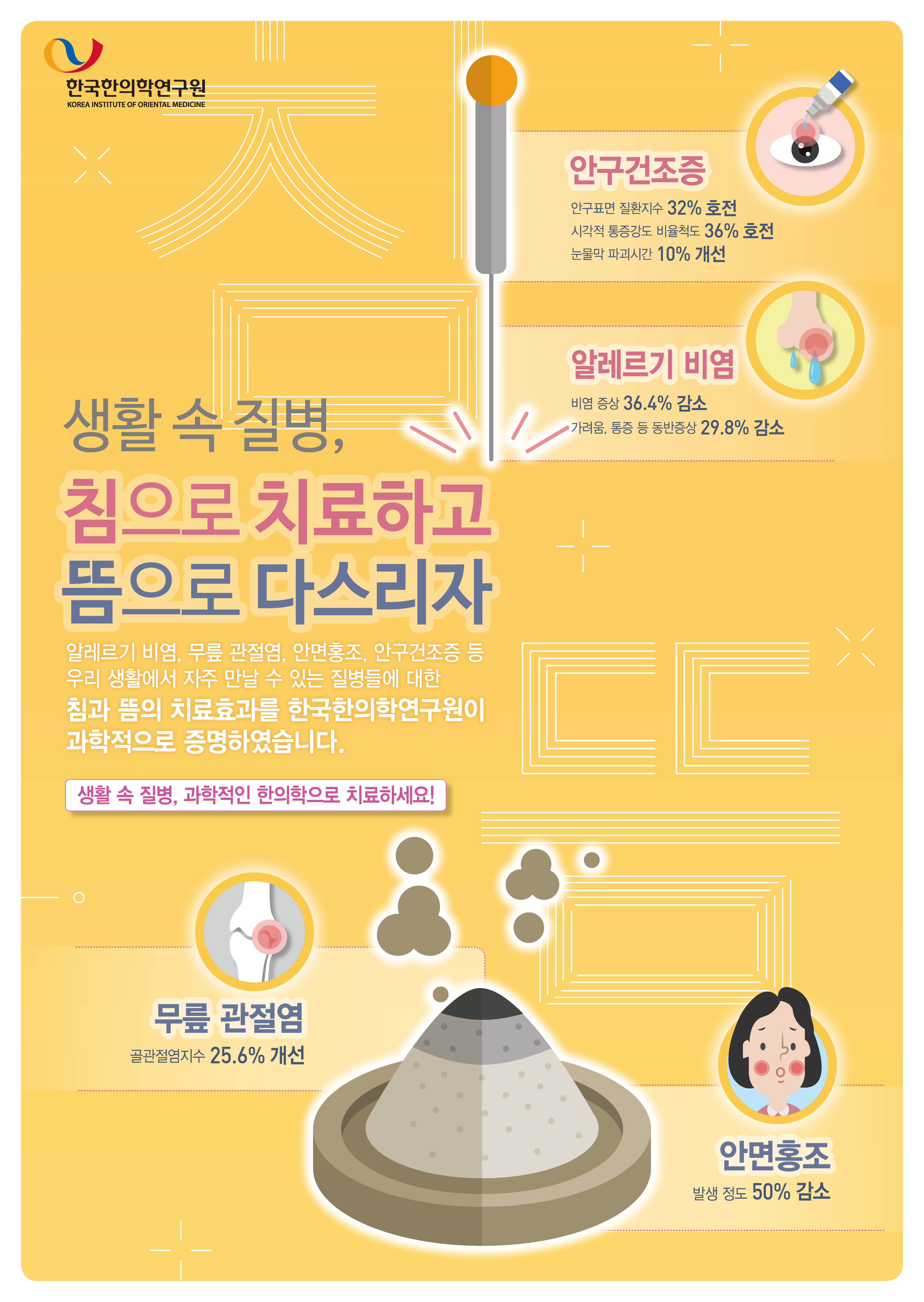'침으로 치료하고 뜸으로 다스리자' 포스터는 알레르기 비염, 무릎 관절염, 안면홍조, 안구건조증 등 한의학연이 임상연구를 통해 규명한 침과 뜸의 치료효과에 대해 소개하고 있다.