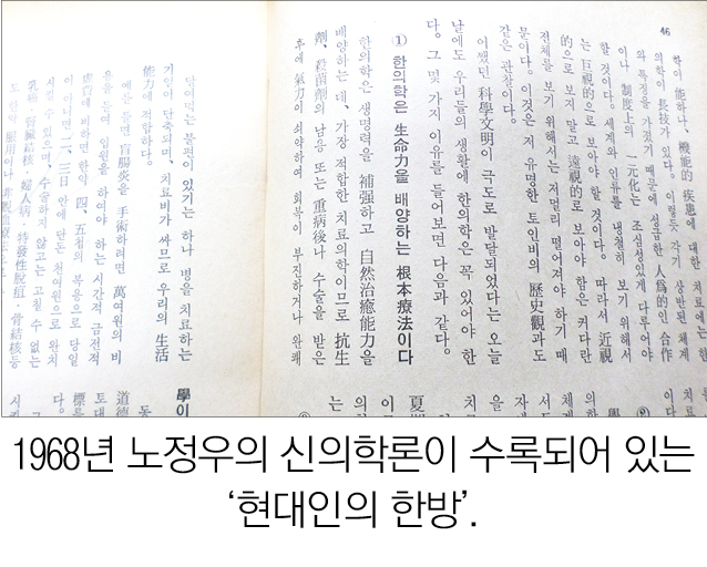 [한의신문] 1968년 盧正祐 敎授(1918∼2008)는 『현대인의 한방』이란 제목의 책을 간행한다. 이 책은 제1부 새 醫學의 얼굴, 제2부 건강과 행복의 博物誌, 제3부 한의학의 비전으로 구성돼 있다. 盧正祐 敎授는 황해도 松禾郡 豊川 출신으로 金永勳·趙憲泳의 門下生으로서 한의학을 연구해 한의계를 학술적으로 이끌어준 인물이다.
