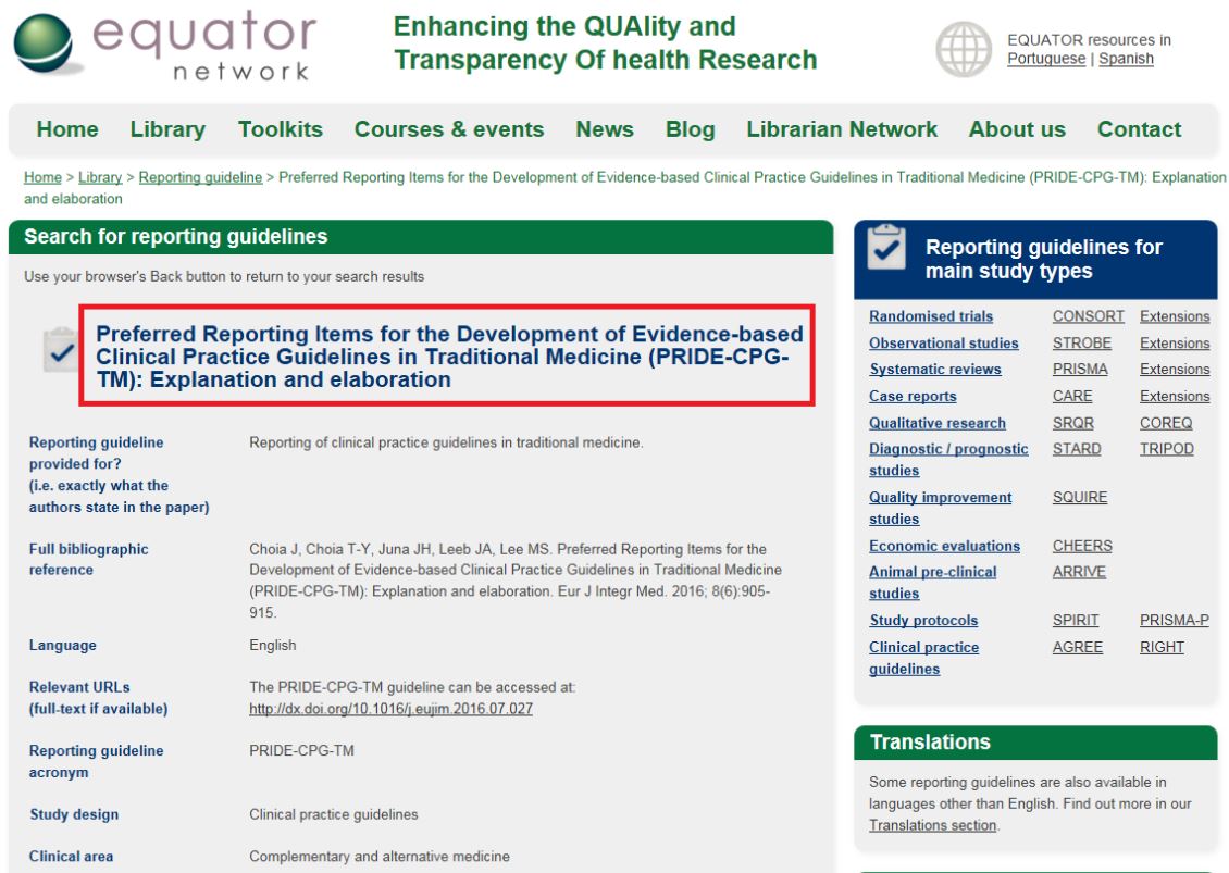 특히 '전통의학 임상진료지침 개발 보고 가이드(PRIDE-CPG-TM)'는 이번에 전통·통합의학 분야의 임상진료지침 연구에 대한 가이드로서는 최초로 이퀘이터에 등록됐다.