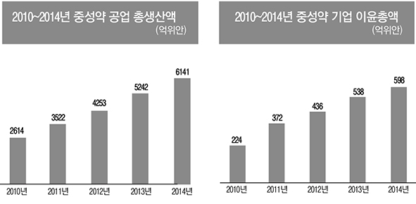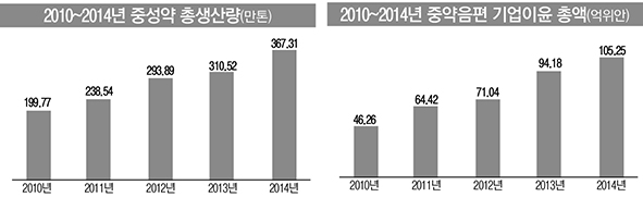 중약음편 기업은 900여개로 생산량은 450만톤, 기업 이윤총액만 105.25억위안(한화 약 1조8424억원)으로 2005년~2014년 간 기업 이윤총액의 복합성장율은 33.8%다.