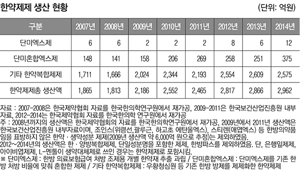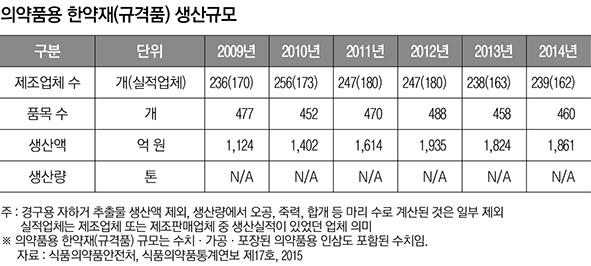 반면 ‘2014 한국한의약연감’에 따르면 우리나라 한약제제 생산액은 2014년 2962억 원으로 2013년 2866억 원 대비 약 3.3% 증가한 것으로 추정된다.
